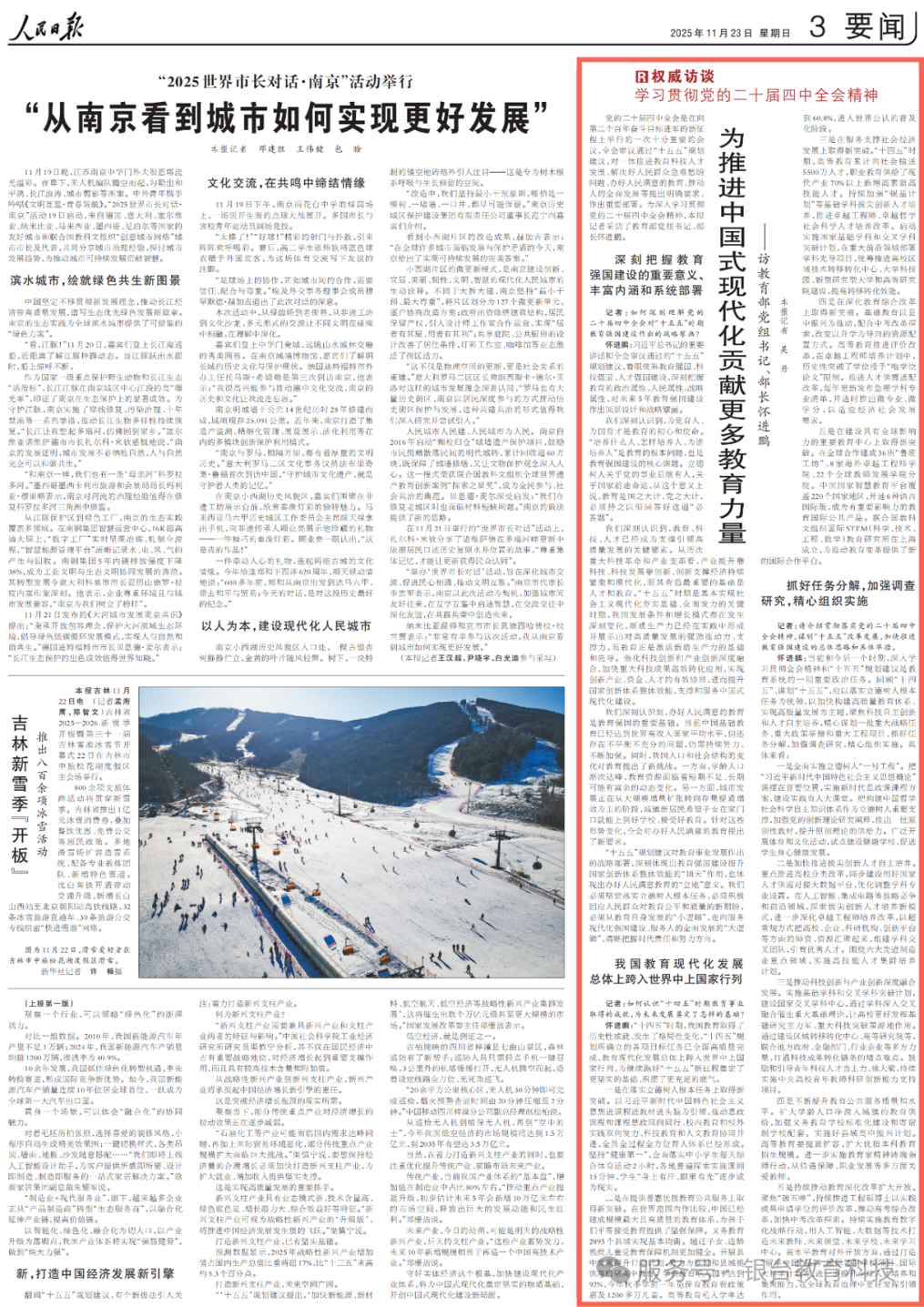 11月23日,《人民日报》“权威访谈·学习贯彻党的二十届四中全会精神”栏目采访教育部党组书记、部长怀进鹏。一起来看——